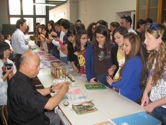 5月12日下午,艺术家们在东方大学地中海教学大楼,或挥毫泼墨,或镂空剪刻,或揉搓拧捏,向东方大学和部分孔子课堂的一百多位师生,奉上了一场精彩的艺术盛宴,使意大利学生和教师们第一次面对面、零距离地亲身感受中国一流艺术家们带来的书法、剪纸和面塑等中华传统文化艺术的展示。整个展示持续2个多小时,市民和师生们兴奋异常,紧紧地簇拥在艺术家们周围,一面观赏,一面啧啧称奇,不时地为艺术家们的精彩表演报以热烈的掌声,现场气氛十分热烈。许多观众还按耐不住,纷纷要求艺术家们当场教授他们如何剪纸、怎样捏面塑。艺术家们手把手地传授技艺,令他们如痴如醉。短短的两个小时很快就结束了,但观众们流连忘返,迟迟不愿离去,纷纷抢着和艺术家们合影留念。