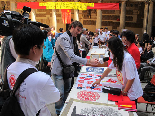 5月10日下午,在帕多瓦大学总部的Palazzo Bo古庭,来自北京国粹苑的书画家王子和,剪纸大师张树贤、付秀清,面塑大师张俊显为帕多瓦市民奉上一场艺术的盛宴,使帕多瓦市民面对面零距离地感受中华传统艺术,再次点燃了帕多瓦市民对中华文化的浓厚兴趣,现场不断传来bravissimo(太棒了)的赞叹声。帕多瓦孔子学院理事长米拉内西教授、帕多瓦大学外事副校长马丁教授、帕多瓦市负责跨文化政治事务的议员艾娃尼耶女士,帕多瓦大学语言中心理事长艾玛奴拉教授应邀出席。帕多瓦孔子学院的学生及当地市民400余人参与了本次活动。5月11日上午,艺术家一行来到了帕多瓦孔子学院伦蒂那拉市教学点,200多名小学生将艺术家们团团围住,他们对书画、面人、剪纸充满好奇,跃跃欲试,艺术家和小朋友的频频互动使现场充满了欢笑声。伦迪纳拉综合学校校长桑克提斯先生,市文化局市议员撒卡尔丁先生出席了活动。威尼托大区的多家媒体对这次活动给予了关注。当地电视台播放了此次活动的新闻,创刊于1887年的报纸Gazzettino以“波之宫的中国魔力”为题进行了报道。