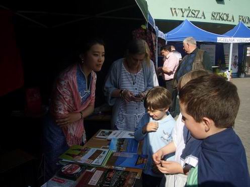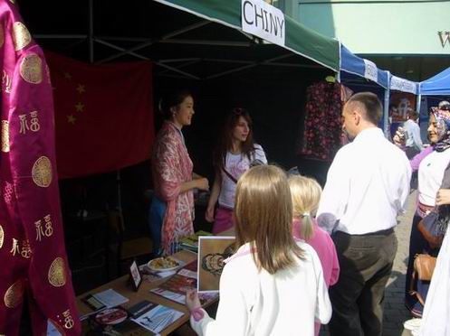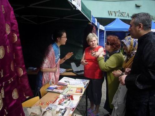密茨凯维奇大学孔子学院为参加此次文化活动,特意准备了中国传统文化展台,展出中国传统服装、剪纸等。孔子学院派驻该校汉语教学点的汉语教师瞿雯文则身穿旗袍,更是夺人眼目。维斯瓦大学副校长Murat Kaplan先生今天也兴奋异常,特意穿上了在中国参加本土教师培训时带回的中国唐装,亲自为中国传统文化展台进行布置,并始终在中国传统文化展台前亲自接待,推介中国文化。