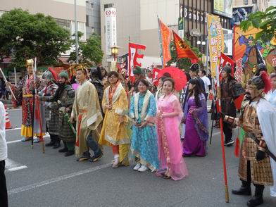 由课堂教师和中国留学生组成的“三国人物游行”队伍,通过展示中国传统服饰,向广大神户市民宣传了中国传统文化。