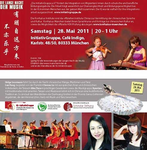 2011年5月28日,慕尼黑孔子课堂与慕尼黑国际教育协会(InitiativGruppe – Interkulturelle Begegnung und Bildung e.V.)合作举办了“慕尼黑音乐之夜•中国民乐歌舞专场音乐晚会”,历时3个小时的晚会为近百名观众带来了一场音乐盛宴。