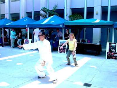 艺术节第二天,迈阿密达德学院孔子学院的中国文化展台前更是人头攒动、热闹非凡。学太极的、练气功的、踢毽子的、打乒乓的应有尽有,学说中国话的、学唱中国歌的、练习毛笔字的更是兴致勃勃。中方院长张蓊荟博士及夫人沈晓红老师为观众耐心展示汉办赠品“汉语有声挂图”,吸引了不少好奇者驻足聆听并点播图片。汉语教师张婧和志愿者杜也佳则挥毫泼墨为观众展示中国书法。好一派中国文化的体验热潮!