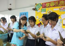 6月6日恰逢中国传统节日端午节,川登喜皇家大学素攀孔子学院与素攀府三汶营中学师生在一起欢度端午节,并联合举办“庆端午”中华文化体验活动。 素攀孔子学院公派教师及志愿者一行12人于当天下午来到三汶营中学,与该校200多名师生一起进行“庆端午”中华文化体验活动。 活动以包粽子为重头戏,素攀孔子学院的志愿者们首先把自己做好的粽子分给学生品尝,接着给学生讲解中国端午节的起源,介绍中国端午节的习俗,赛龙舟的传统,讲屈原的故事……三汶营的学生还在志愿者老师的帮助下亲身体验包粽子的过程:志愿者老师耐心细致地讲解粽子的制作步骤,并且亲自为大家示范,泰国学生在实际操作过程中展现了良好的手工制作基础和团队合作精神,几人一组,互帮互助。在欢快的气氛中,每个人都收获了端午节的喜悦。