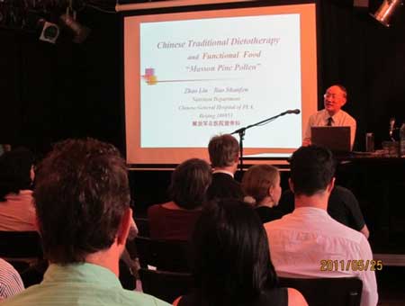 2011年5月25日18时,来自中国人民解放军总医院营养科的副主任、健康教育首席专家赵霖教授为慕尼黑市民带来一场题为“中国传统食疗与食物保健”的精彩报告。60人的报告厅座无虚席。除了对中医感兴趣的慕尼黑市民外,慕尼黑领事馆戴继强领事和慕尼黑孔子课堂的外方合作者东方基金会三位理事也都出席了报告。