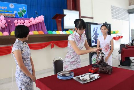茶艺体验环节,一名名身穿旗袍的泰国学生在志愿者老师陈俊池的示范下优雅、熟练地沏、闻、斟和品。老师们还就有关端午节相关小常识,在现场进行了抢答,学生们争先恐后,踊跃参与。