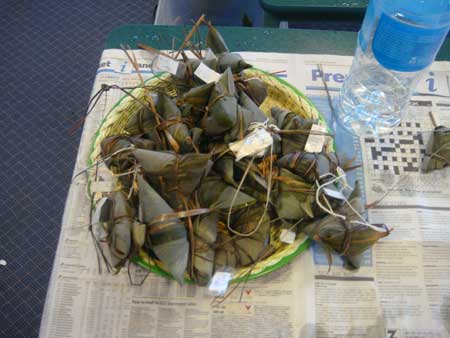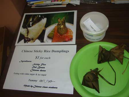 活动的第三个环节,推销粽子。为了让更多的人了解中国文化,体验中国美食,学生们将所包的粽子在次日上午课间休息时间向学校的老师和同学推销义卖。粽子一推出,彻底吸引了师生的眼球。一个上午不到,桌子上的几盆粽子被师生一抢而空,有些学生更是一口气买了几个,说要带回家与家长一同分享。有些老师更是可爱,将粽子小心翼翼地打开,欣赏后又将它按原来的方法包了回去,预备下班后自己买材料动手也来包一包。此次包粽子活动,不仅让师生一同分享了学生们的胜利果实,而且给所在学校的师生打开了一扇了解中华文化的窗户,让更多的人在快乐中体验了中华文化。