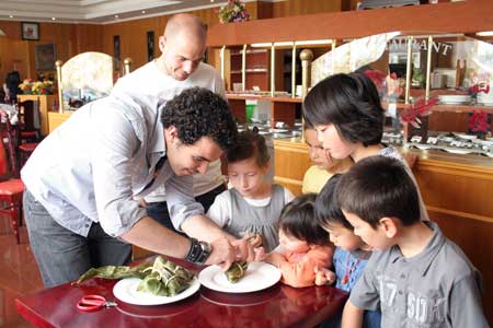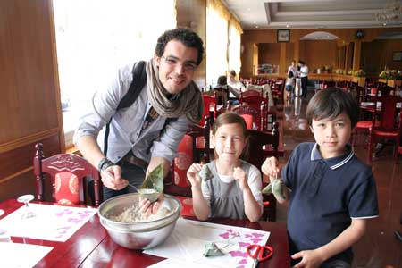 学员们对这样一个新奇的食物充满了兴趣,包粽子现场被一片热闹的气氛包围着。不多久的功夫,一个个形状各异的粽子摆满了桌子。粽子被煮好,粽香四溢时,学员们早就按捺不住兴奋的心情,欢呼着品尝自己亲手做的成品。糯米粘着白糖,大家吃得津津有味,对中国美食赞不绝口。