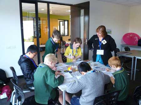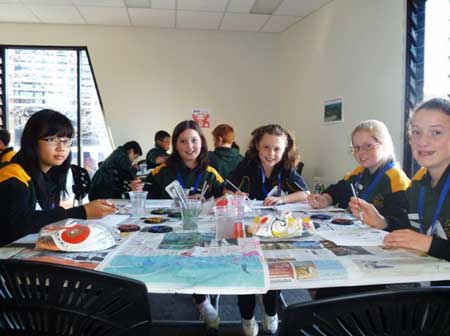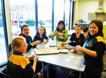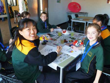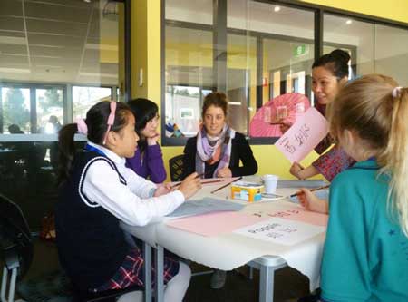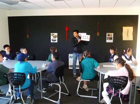 在本迪戈高中新落成的语言中心里,孔子课堂的老师们为中澳小朋友精心准备了独具特色的活动。他们一起包饺子,虽然有的饺子的样子有点古怪,但当他们品尝到自己的劳动成果的时候,表情是那样的骄傲和幸福;他们一起学习汉语,在汉语课堂上,中国的小朋友都成为了小老师,他们的信心和耐心得到了极大的发挥,中澳小朋友共同合作学汉语,并进行对话练习,课堂气氛愉快而活跃;京剧脸谱吸引了同学们的注意力,他们用彩色画笔在模版上描绘,专注程度让人钦佩;还有在书法课堂上,他们使用中国的毛笔书写汉字,在挑战面前,他们挥毫泼墨、大胆尝试;同学们最喜欢的就是做游戏了,他们一起丢手绢,互相追逐,玩耍并快乐着。