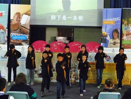 语言中心的活动结束后,同学们又齐聚礼堂。各个学校的师生向大家奉献了精彩的节目。自弹自唱、小提琴演奏、小合唱、笛子曲和中国功夫表演等等,他们奉献的不仅是精湛的演技,而且是他们的热情。一场中澳小朋友的节日联欢正在上演。演出结束后,同学们合影留念,依依不舍地离开了本迪戈高中。