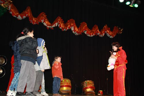 为了推广孔子学院的汉语教学,孔子学院中方院长现场为观众上了一堂简短而生动的汉语公开课课。只见她在台上指着自己的眼睛教大家说:“眼睛,眼睛……。”台下观众也指着他们的眼睛齐声应和,500多人同时发声,其壮观场面可见一斑。教完后中方院长还特别挑了几个小观众上台与他们做起了语言游戏以检验他们学的成果,检验过关的都获得了毛绒玩具兔作为奖励。