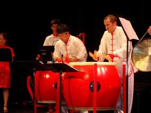 音乐会的演出曲目,也经过了精心选择。为了突出演出的中国文化内涵,李琦教授专门为孔子的“有朋自远方来,不亦乐乎”譜上曲子,让美国学生在演奏的过程中,用中文缓缓吟唱,深沉而悠远,取得了独特的艺术效果;中国民族器乐合奏《旱天雷》节奏欢快,活泼流畅,把浓郁的中国广东地方色彩表现的淋漓尽致,也调动起了场内观众的兴奋情绪;由葫芦丝领奏的《边寨月夜》好像给观众展示了一幅月夜下的中国傣族的风俗民情图画。葫芦丝的独特造型引起了美国观众的好奇,它的优美音色和抒情旋律更是给人以美的享受,激起了美国观众的阵阵掌声;打击乐《老虎磨牙》一出场就不同凡响,参加演出的美国学生先用风趣幽默的语言介绍该曲目的内涵。最初,观众们似乎对这些中国锣鼓如何表现“老虎磨牙”存有疑惑,但他们很快就被那令人眼花缭乱的击打手法所折服,富于变化的鼓声,呼呼生风,铿锵有力,生动地塑造了老虎的威猛形象。观众席上会心的笑声、热烈的掌声响成一片,把音乐会带入了高潮。