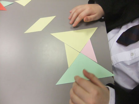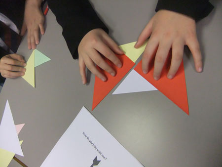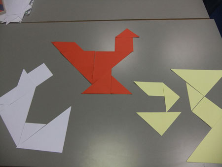学生们细心聆听教师的讲授,很快就做出了自己的七巧板。大家分组进行计时比赛,看哪组同学能用最快的时间拼出规定图案。不管输赢,学生们都玩得兴高采烈,当他们拼出自己要想的创意图案时,更是充满了创造的乐趣。