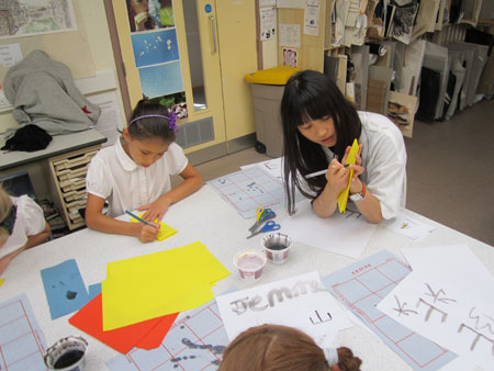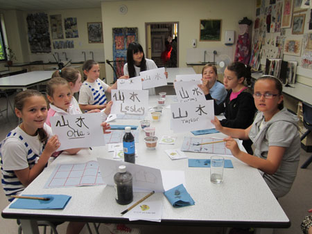 在中文部分,我们精心准备了中国传统舞蹈、中国书法和剪纸活动。在中国书法和剪纸活动中,我们教给学生基本的书法知识和汉字结构,运用想象力帮助她们分析汉字“山”和“水”,让她们最终能写出美丽的“山”和“水”。