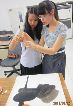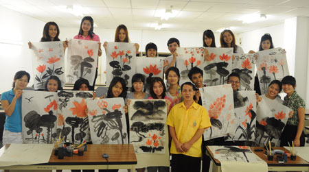 普吉孔子学院特邀中国画讲师郭晶晶向学员们介绍了中国画的发展脉络、主要特点,以及各种作画工具的用法。为了更好地使大家领会中国画的艺术特点,郭老师现场演示了水墨荷花的画法,学员们兴致勃勃、边学边画,在郭晶晶老师的悉心指导下,将他们丰富的想象力运用到中国画中,绘制出一幅幅各具特色的画作。活动在欢快愉悦的气氛中进行。最后,学员们大方展示自己的作品并与郭老师合影留念,表达了对中国画的浓厚兴趣和对中国文化的无限敬仰。