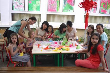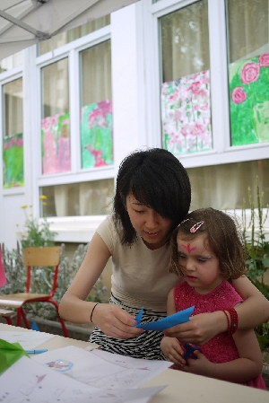 中国结、红灯笼,Renaudot幼儿园装饰得喜气洋洋,孩子们自愿参加“折纸组”、“剪纸组”、“中国结组”和“生肖组”,手工制作、学习用汉语说“你好”、“谢谢”、“好看”、“喜欢”等几个简单的汉语词汇,孩子们玩得不亦乐乎,很多家长也被吸引过来和孩子们一起活动。孩子们提出很多关于中国文化的小问题,例如“我出生在2007年,我是猪吗”?孔子学院老师则耐心地解释“汉语说,我属猪,不说我是猪”。活动现场不断传出阵阵欢笑声。