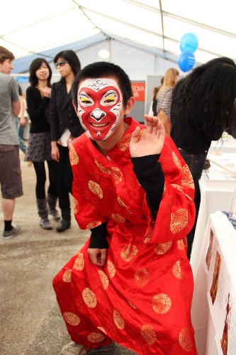 传统的唐装和精美的中国书籍,使孔子学院的主展台充满了中国特色;以往活动照片上学生灿烂的笑脸,不断循环播放的由阿大孔院主办的2011年世界中学生汉语桥澳大利亚赛区决赛录像,又凸现了我们快乐活泼的气质;孔子学院志愿者在现场绘制京剧脸谱更是受到学生和家长们的关注。