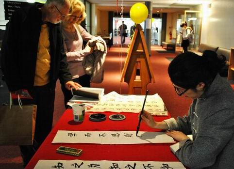 此外,和去年一样,孔子学院还与大学文化与遗产中心合作,在大学图书馆举办了中国书法现场演示活动。学生和家长们纷纷选择他们最喜欢的孔子名言,之后由擅长书法艺术的孔子学院志愿者用楷体写下来送给他们,以具体形象展示的方式让他们对中国文化有更深的理解。
