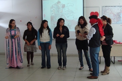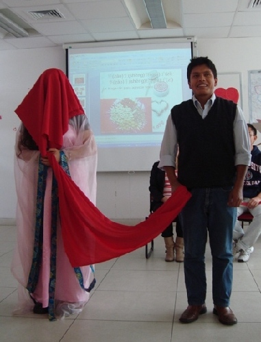 8月8日,秘鲁天主教大学孔子学院举办了以“浪漫七夕,歌颂爱情”为主题的活动来庆祝中国传统情人节 ——七夕节。七夕节又名“乞巧节”、“七巧节”。通过活动,学生们不但了解了中国七夕情人节的文化传统,还了解了中国人的爱情观、婚姻观和家庭观以及中国传统的婚俗文化。整场活动分为祈求爱情、遇到爱情和结婚礼成三个环节。志愿者教师金喜红身着传统汉服与外方工作人员Patty Ortiz一起主持了活动。
