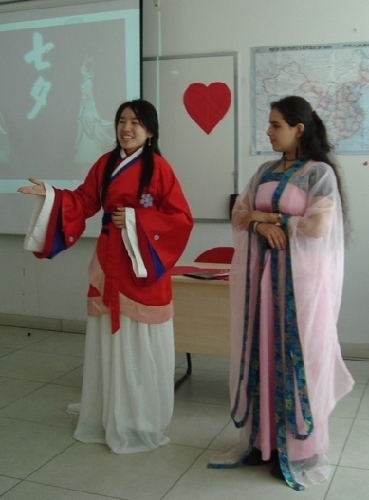 志愿者教师刘瑶以PPT形式,配合音乐和图片讲解了“七夕节”又名“乞巧节”即祈求爱情的寓意。身着传统汉服的志愿者教师——金喜红和中级班学生——马楠佳一起为大家呈现了中国传统年轻女孩如何通过拜香来表达祈求爱情的美好心愿。
