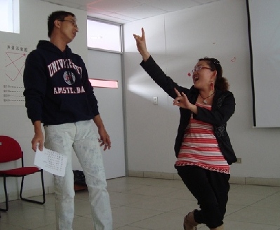 借此,汉语教师高建国和志愿者教师曾敏为大家带来了黄梅戏《天仙配》选段。两位老师表现得惟妙惟肖,赢得了学生们的热烈掌声。