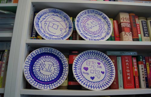 学生的水墨画作品展示。学生们将中国的汉字和水墨画相结合,创作出了样式新颖、风格多变的“中国盘子”