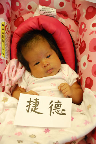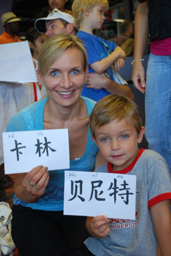 母子俩人拿着自己的中文名字