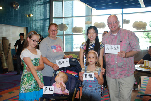 费佛尔大学孔子学院老师谌思澜(后排右二)为这一家人书写了中文名字