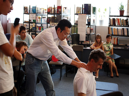 茶话会上中摩师生还共同表演了合唱《月亮代表我的心》、诗朗诵《水调歌头》、武术表演、扇子舞、中医按摩演示等节目,整场活动互动热烈,高潮迭起,始终洋溢着欢歌笑语与融融友情。