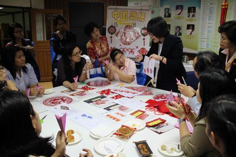 本次活动正值中国民俗节日中秋节之后,为了让泰国朋友了解中国传统的民族节日的由来和意义,曼松德孔子学院还安排了中秋节文化讲座。讲座后学员分为四个组分别体验中国传统文化。在曼松德孔子学院志愿者老师的指导下,学员们兴高采烈地积极参与,有的用毛笔写出“福”字、有的用红纸剪着各种图案、有的用一根根红色的绳子编出漂亮的中国结,场面好不热闹。