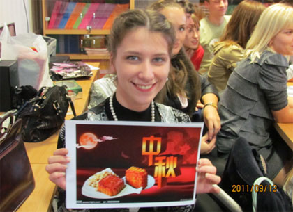 同学们的汉语水平还真是不能小瞧,他们的翻译作品不光能把古诗的词义翻译出来,而且还巧妙的表达出了诗词的韵律。在赛诗会中,全体师生一边观看由中国老师优美的笛子演奏,一边品尝着中国带来的月饼,增添了浓厚的节日气氛。“明月几时有,把酒问青天,不知天上宫阙,今夕是何年”。