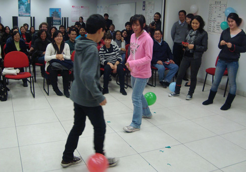 如何消散中秋节的那份“愁”呢?孔子学院组织了“踩掉忧愁,踩掉烦恼”的趣味游戏环节。十位自告奋勇的学生在志愿者教师王兰婷的组织下参加游戏。每位学生的脚上都绑有一个气球,气球里装有与中秋节或中国文化有关的问题,两个学生进行对决。任何一方只要踩爆对方的气球,即抢得答题的优先权,正确回答出气球中的问题,便可获得一份奖品。若答错,则把答题机会让给另一方。双方若都答错,则把机会留给观众。学生们通过此类趣味的游戏,加深了对中国文化的理解。