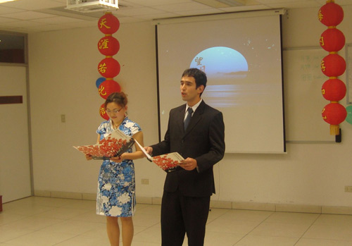 接着,曾敏和Paco分别用汉语和西班牙语朗诵了一首望月怀人的古诗——李白的《静夜思》。伴着古典的乐曲,他们声情并茂地向学生展示了古诗蕴含的意思,让学生充分体会中秋节蕴含的那份“乡愁”。学生们很快学会了这首诗,并当场进行了朗诵。
