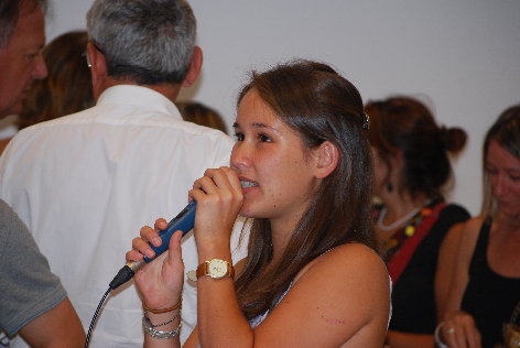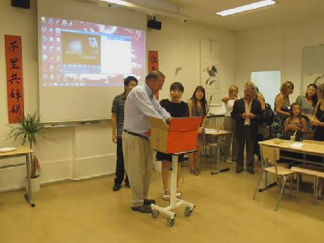 节目表演完之后,格二大校长Spalanzani先生、副校长Claude Benoit 先生为大家抽取中秋知识问卷的获奖者,并为他们颁奖。两名获奖的法国人拿到纪念品(写有中国古诗的折扇),喜出望外,当即展开折扇,辨认自己认识的汉字,并询问其中的含义。随后,大家伴随着音乐,一展歌喉,引来一片片叫好声,现场气氛热烈而温馨。