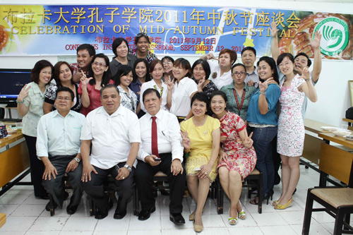 9月12号上午,孔子学院的专用教室里张灯结彩,喜气洋洋。孔子学院精心准备了月饼、水果、瓜子等传统节日食品,特别邀请布拉卡大学校长Dr. Mariano C. De Jesus和几位副校长、部分院系主任及相关行政人员40余位嘉宾参加了“2011年布拉卡大学孔子学院中秋节座谈会”。