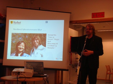 挪威北方省政府经济贸易发展部国际关系高级顾问Per Eidsvik先生在晚会上演示了北方省为参加上海世博会准备的报告,大家看到,世博会为中挪在各领域的友好交流提供了重要的平台。