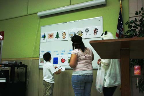 “找朋友” 游戏更是让整个课堂上笑声不断。每当小朋友将汉字正确地贴在其对应图片上,就会立即获得一个小礼物。其中,代表中国植物的“富贵竹”大受欢迎。“现学现卖”让在座的小朋友收获不小,他们开心抱得礼物归,连家长们都耐不住要和小朋友们争相发言了。好一派热闹学汉语的景象!