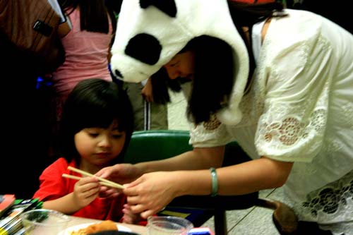 在“品尝中国美食”环节,汉语教师们教大家如何使用筷子。习惯了用刀叉的美国人用起筷子来,姿势千奇百怪,让人忍俊不禁。整个活动期间也是孩子们尽兴,大人们开心。