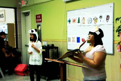 “快乐汉语”是这次活动的第一个高潮。孔子学院学生安旺泰为小朋友们讲述了一个关于主人公“琳”历经千辛万苦寻找她的宠物好朋友“小龙”的故事。接着志愿者杜也佳头戴熊猫帽子,绘声绘色的给小读者们上了一堂轻松愉快的汉语课。她从书中精选出“牛、羊、狗、水”等15个常用汉字,利用图片和汉字的形似,从字形入手,教大家如何用看图识字、快速记忆。