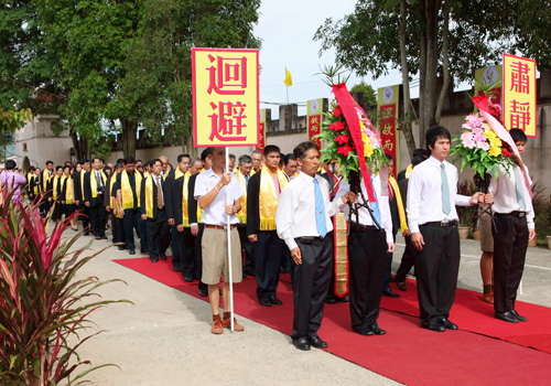 参祭嘉宾佩戴黄巾,缓缓步入“神道”