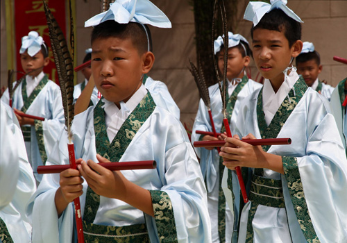 在“聆听遗训”仪式上,36名小学生齐声诵读启蒙养正的儒学经典《论语》、《弟子规》,在琅琅的童声中,全体参祭人员接受先师的教诲。
