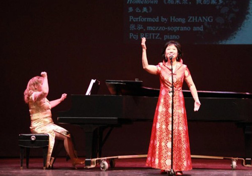“丝之歌”艺术团团长、宾汉顿大学教师、女中音歌唱家张泓为观众们演唱了三首具有代表性的中国民歌:山东的《沂蒙山小调》、云南的《小河淌水》和新疆的《帕米尔,我的家乡多么美》。优美的旋律、熟练的演唱技巧,张老师用歌声为美国观众们讲述着中国山河有多美。让我这个来自齐鲁大地的姑娘不禁开始想家了。