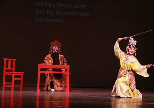 虽然整场演出只有短短的一个半小时,但是样式丰富,包括了中国京剧折子戏片段、传统民乐演奏、传统京剧器乐演奏以及中国民歌独唱。伴着京剧的锣鼓声,第一个节目是《霸王别姬》这出脍炙人口的梅派京剧片段,是由梅派弟子、国家一级演员张晶和中国戏曲学院优秀青年教师贾劲松为观众们呈演的。张晶老师饰演的虞姬拔剑而舞,英气勃发,娇艳动人;眼中的伤感惹人生怜,让观众们心痛感叹;贾老师将楚霸王的傲骨、哀伤在台上展现的淋漓尽致。仅看两位的表演,美国观众便能充分的体会这出戏中主人公所表达的一切情感。楚霸王的脸谱也成了当晚观众讨论的热点之一,美国观众们特别是大学生对中国京剧脸谱兴趣浓厚。