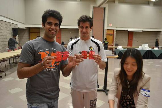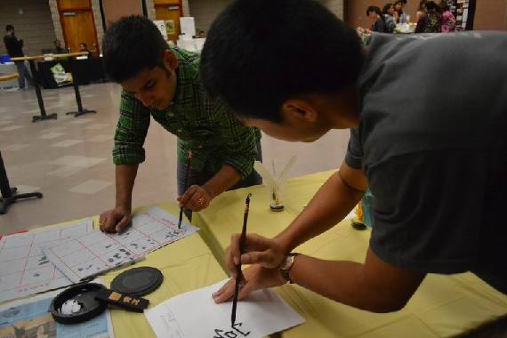 由乔治梅森大学孔子学院主办的中国展台吸引了各国学生前来体验独特的中国东方文化。许多学生都体验了中国的剪纸艺术,在孔子学院原理、张冲二位老师的细心指导下,许多学生都掌握了剪“喜”字这种简单的剪纸艺术。在午饭时间,很多学生还品尝了原汁原味的中国饺子,他们对中国的美食都赞不绝口。更令他们感到惊喜的是,孔子学院的陈闻老师现场为他们起中文名字,并且用中国书法为他们书写中文名字。中国展台吸引了众多的学生前来参观,得到了乔治梅森大学师生的一致好评。
