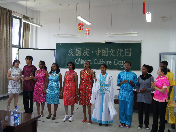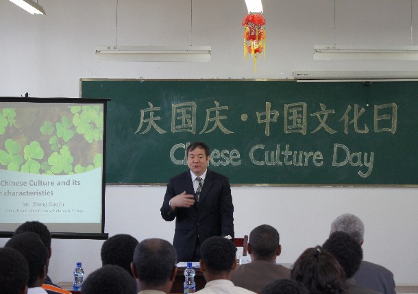 为庆祝中华人民共和国成立62周年,2011年10月1日上午亚的斯亚贝巴孔子学院在报告厅举办“庆国庆—中国文化日活动”。中国驻埃塞俄比亚使馆郑国进参赞莅临孔子学院为孔院学员做了题为“中国文化的核心及其主要特点”的讲座。