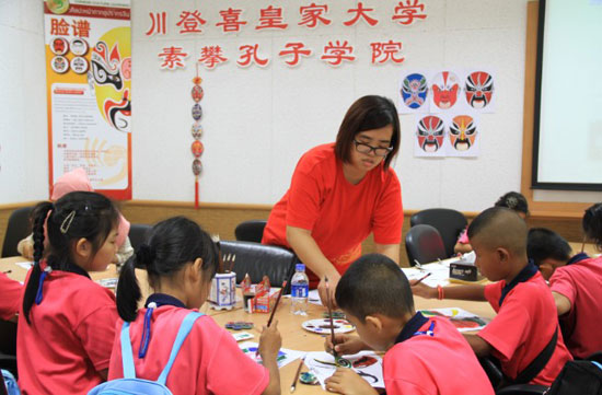 此次活动设置了书法、剪纸、 中国结、京剧脸谱、乒乓球、中国毽子、中国功夫七个文化体验区及一个中文教材展示区,学生们在志愿者教师的引导下分组体验。初次来到素攀孔子学院参加此类活动的学生们对中国文化表现出浓厚兴趣,积极参与到各体验区的亲身实践中,10岁的SARIT 小朋友还一边提问一边在本子上不时地写几笔,把亲身感受记录下来。